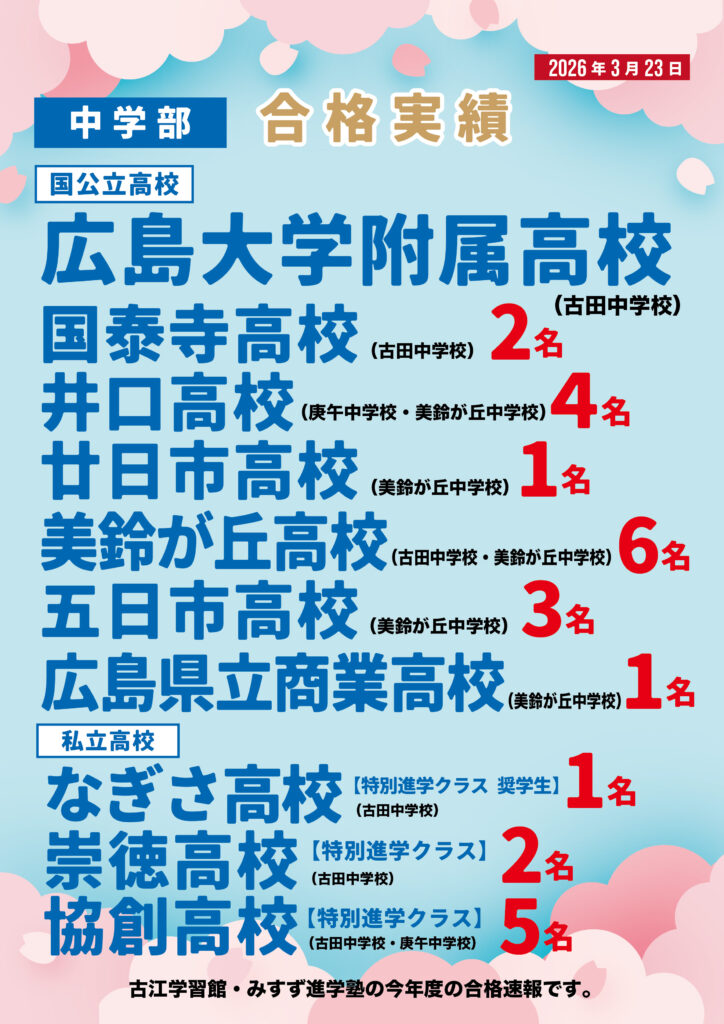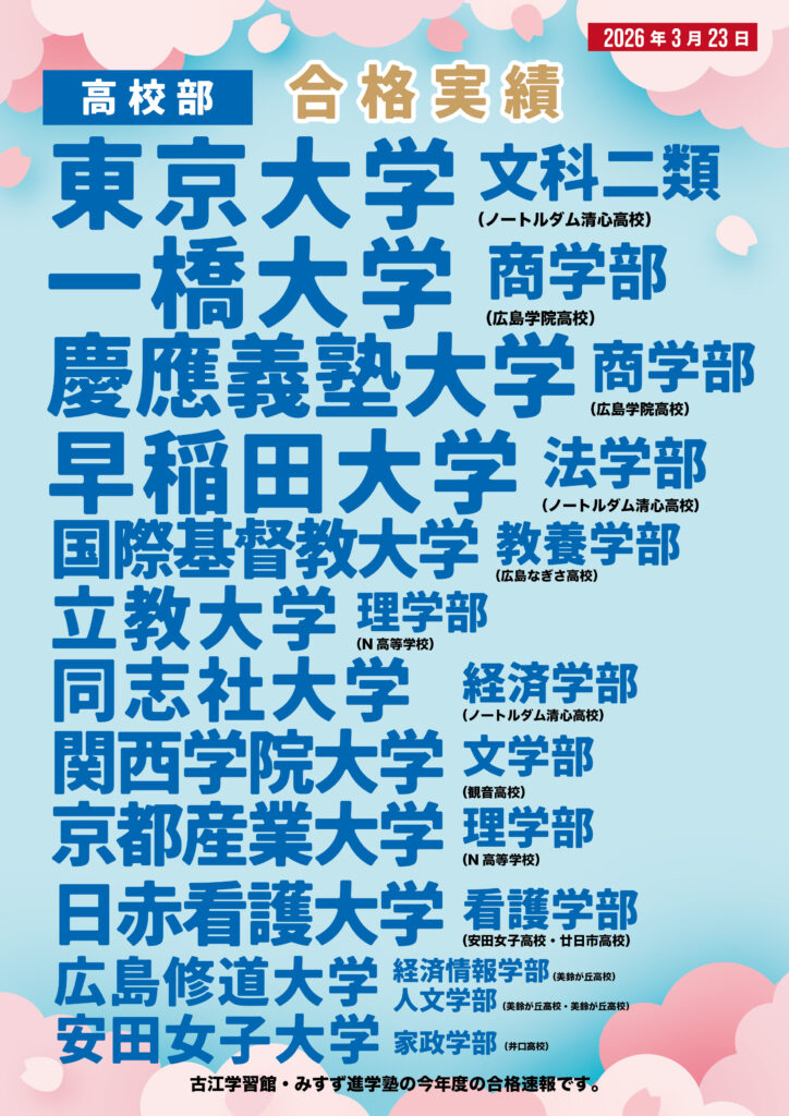 なぎさ高校 みすず進学塾 一橋大学 五日市高校 井口高校 京都産業大学 修道大学ひろしま協創高校 協創高校 古江学習館 古江学習館Lepton古江駅前教室 合格 合格実績 同志社大学 国公立 国泰寺高校 国際基督教大学 大学入試 学研古江駅前教室 安田女子大学 崇徳高校 広大附属高校 広島修道大学 広島県立商業高校 廿日市高校 慶應義塾大学 日赤看護大学 早稲田大学 東京大学 東進衛生予備校古江駅前校 私立 立教大学 美鈴が丘高校 関西学院大学 高校入試